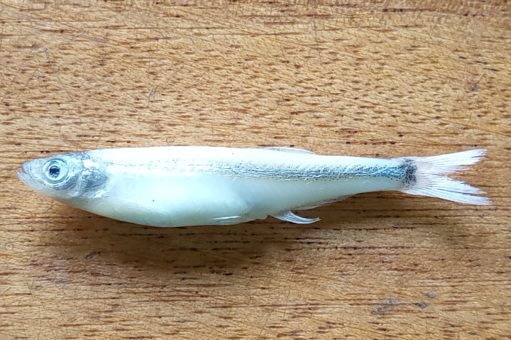 - Colour is intensely silver, surface of head darker. A dark mid-lateral stripe appears after death.
