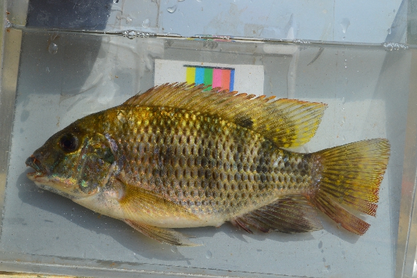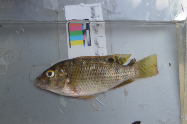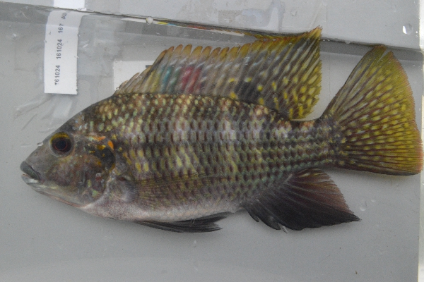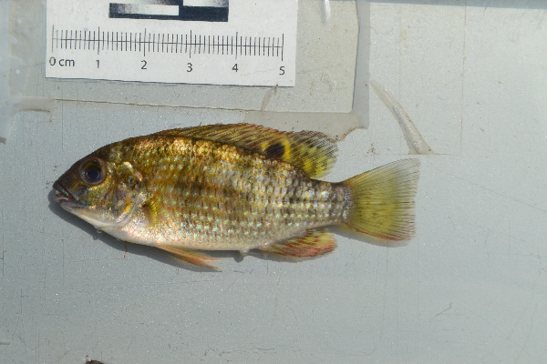 - Distinctive Tilapia-mark on the dorsal fin which persits in adult fishes (large, black, nearly circular spot almost completely outlined in yellow) (Diagnostic)