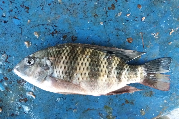 - Tilapia mark (dark spot at the posterior end of the dorsal fin) in juveniles