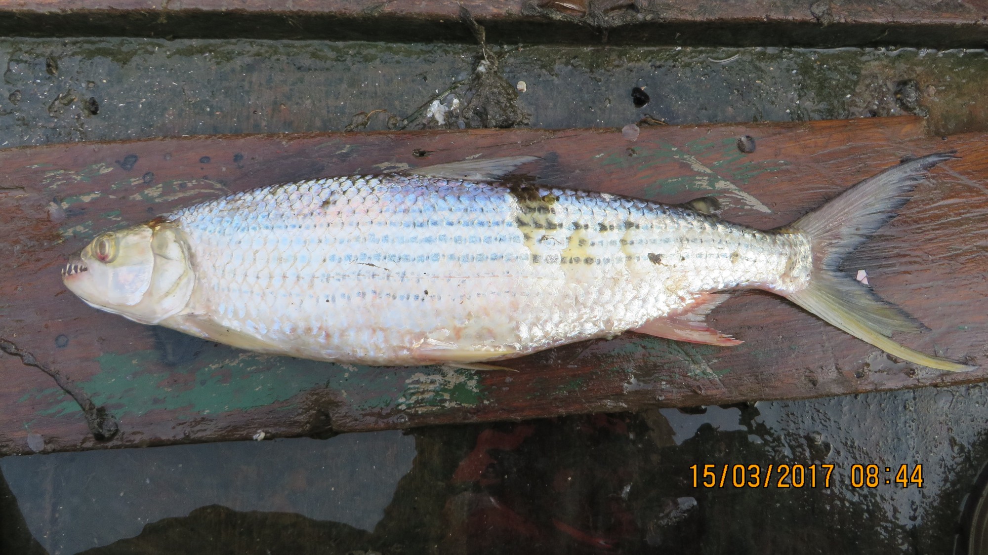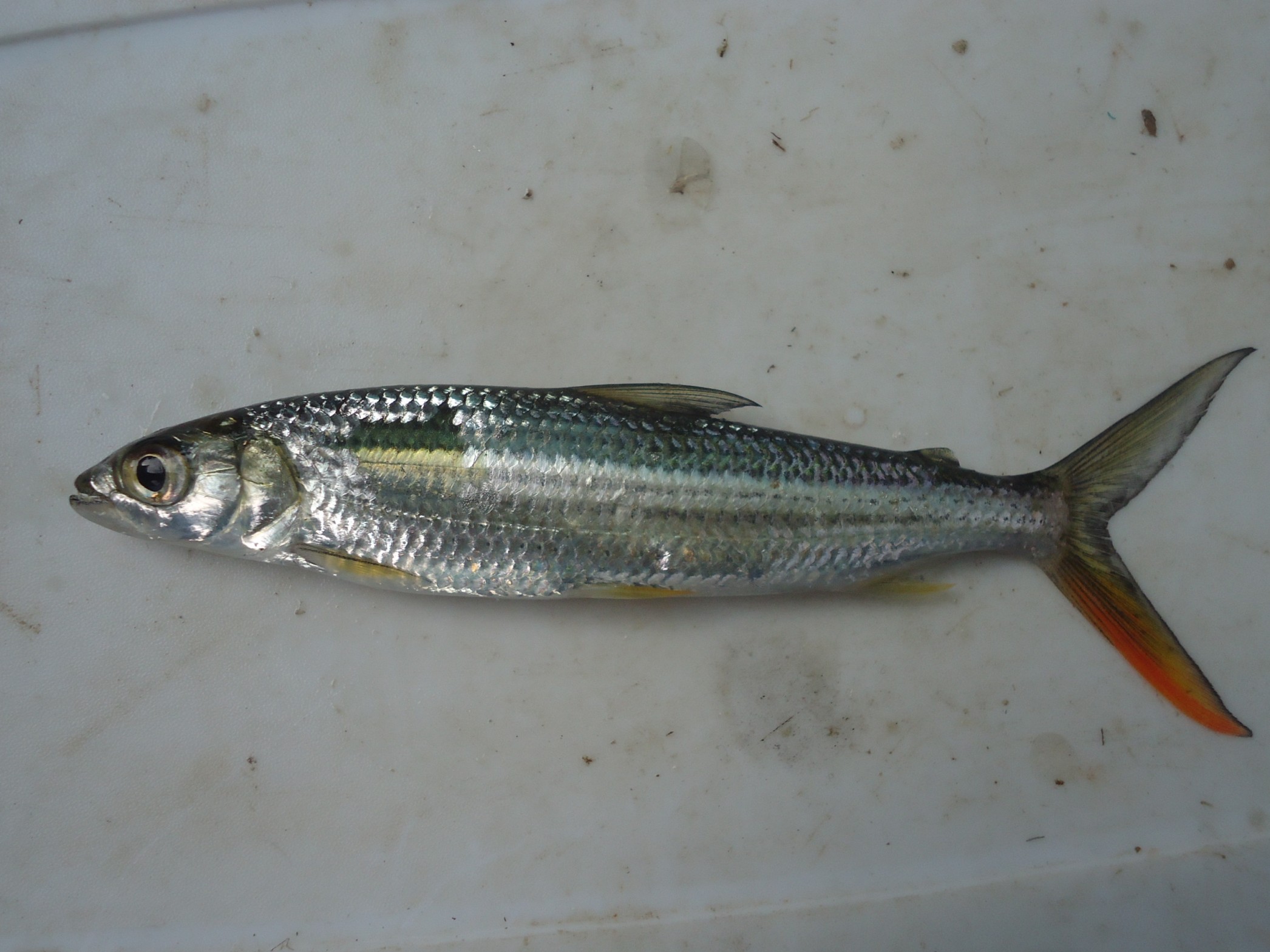- Color is silver or silver-yellow, a drak longitudinal line running through each scale row above (and including) the lateral line and often through the line immediately below. Dorsal and adipose fin grey, pectoral and pelvic fins flushed with orange-yellow, as are inferior caudal lobe and the anterior part of the anal fin. Both caudal lobes are outlined in black along their posterior margins.